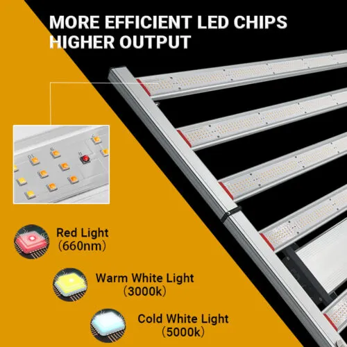 Samsung and Osram LEDs: With over 54,000 Hours Lifespan, the industry-leading Samsung LM301B and Osram 660nm LED's will keep your plants blooming crop after crop. Our foldable LED grow light is equipped the full color spectrum 3000K 5000K 660nm, they are ideal for all growth stages. Excellent Heat Dissipation: 640w LED grow light using the best quality 6063 aluminum material for the light body, the best heat dissipation and touch. Each light weighs 1KG, which is 30% heavier than others. Inventronics LED Driver: The driver for the LED cannabis grow light is Inventronics, rated for 120-277V input voltage, it is more suitable for commercial applications. In addition, we can extend the power cable between the driver and the light. External Control:Foldable LED grow light is compatible with our controllers. It is equipped with an external RJ14 Cable and allows you to install up to 200 fixtures per controller port by