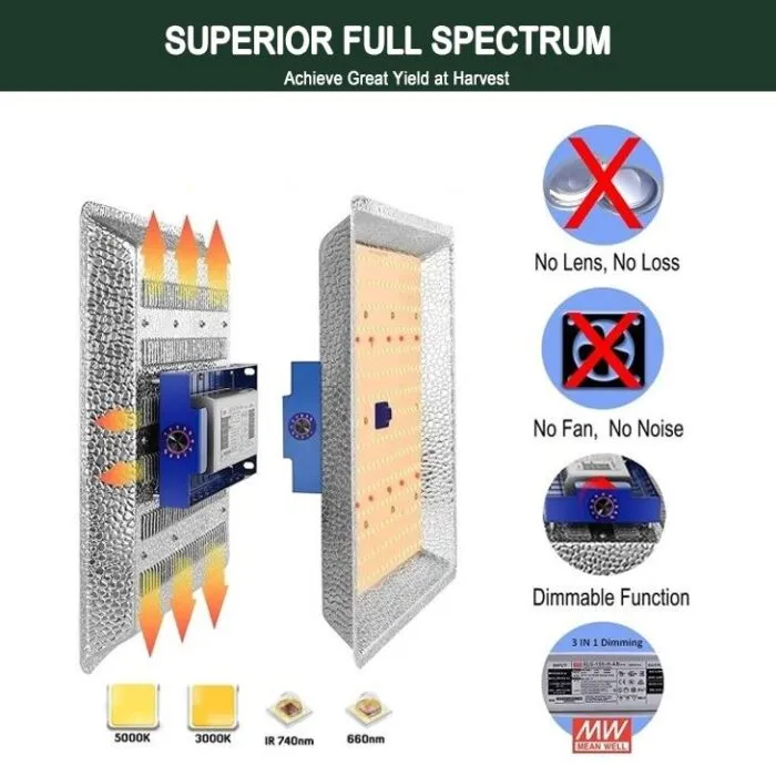 VYSOKÝ REFLEXNÍ & Konstrukce LED GROW SYSTEM BEZ NOISE-FANLESS vám usnadní a ztiší život, rychle rozptylující materiál hliník, který snižuje ztráty světla v uličkách a stěnách, zvyšuje intenzitu světla až o 20 %, což umožňuje vašim rostlinám přijímat více energie a bez spálení vašich rostlin pro maximální světlou výšku.