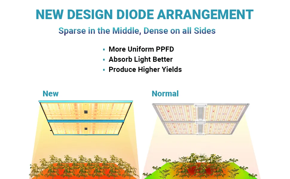 The spectrum of LED hydroponic grow light infinite close to natural sun light adopts Samsung LM301b diodes, high energy efficiency with 2.7μmol/J, generates more usable lighting per watt and provides better light canopy penetration.