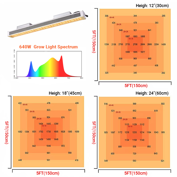 Við notum nýjustu LED tækni og sjónhönnun. Hver stöng vaxa ljós getur náð ljósstyrk upp á 1200μmól/m2/s til að mæta lýsingarþörf plantna á mismunandi stigum vaxtarferilsins.