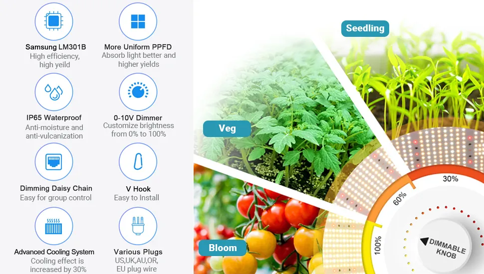 The spectrum of seed starter grow light infinite close to natural sun light adopts Samsung LM301b diodes, high energy efficiency with 2.7μmol/J, generates more usable lighting per watt and provides better light canopy penetration.