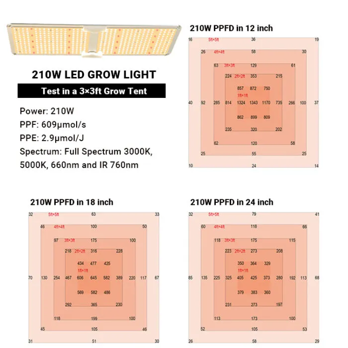 This full spectrum light for plants is used with Samsung 3030 diodes, high energy efficiency with 2.9μmol/J, light output PPF is 609μmol/s, create the better canopy light penetration. It only consumes 210w, running 50% less power than the HPS lamps, and still was 50% more harvest.